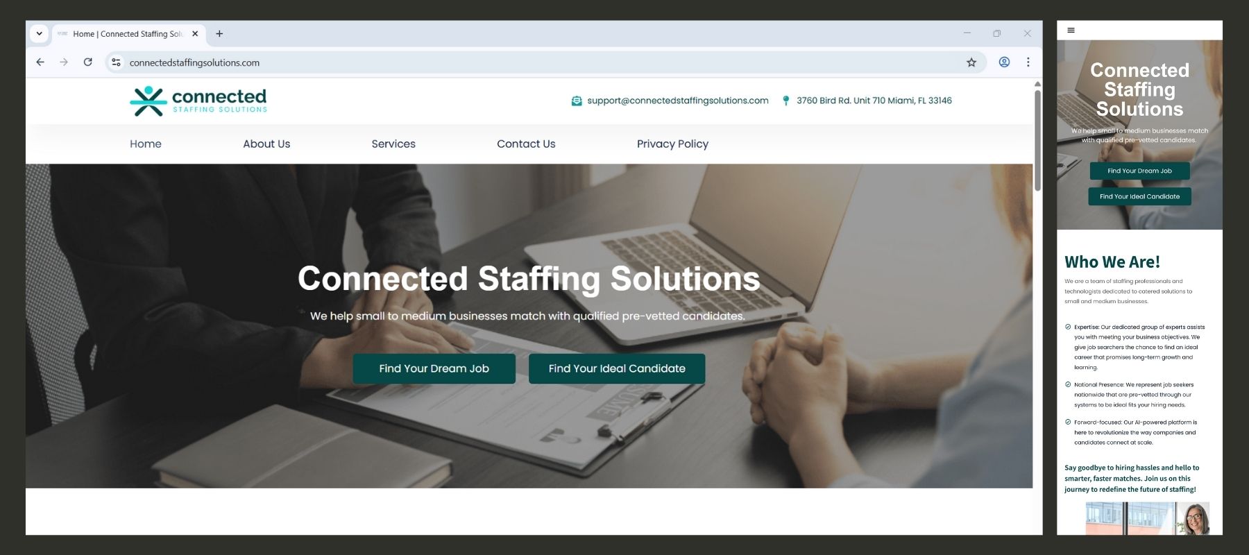A multi-page website for a staffing and recruiting agency that helps businesses hire faster through pre-vetted candidates and AI-powered matching for long-term success.